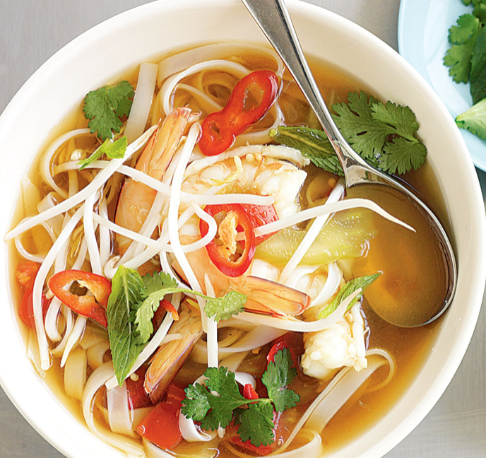 A hearty and flavorful bowl featuring plump, juicy prawns and a colorful assortment of fresh vegetables, gently simmered in a bold hot-and-sour broth that delivers the perfect balance of tangy brightness and warming spice. Silky rice noodles soak up the deeply aromatic broth, creating a comforting yet invigorating texture in every bite. The dish is carefully finished with a generous garnish of fresh cilantro, adding a refreshing herbal lift that enhances the savory seafood flavors. Robust, satisfying, and full of character, this dish is ideal for those who crave a comforting noodle soup with a vibrant kick and layered depth of flavor.